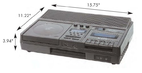 - Cassette Tape Recorder/Player: plays audio cassettes and records to tape audio played on the CD or USB player